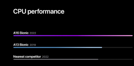 话虽如此,现实可能并不遥远。在演示过程中,Apple展示了这张图表,将新的A16与2019年的A13芯片组进行了比较,称CPU性能提高了33.3%。这是三年的时间,因此与去年相比,这9%看起来是可信的。