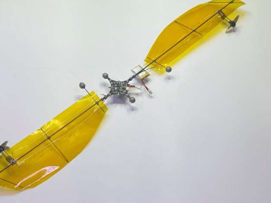 大多数无人机都有旋转转子来提供升力。这种新设计在机翼末端有两个微型转子,可以使它们旋转——升力来自旋转的机翼,从而提高了效率。研究人员还在无人机的中心添加了电子设备和电池。整机重量不到 35 克,转速约为 200 转/分。测试表明它能够在空中盘旋长达 24 分钟。研究人员指出,由于设计固有的稳定性,不需要稳定的微处理器。他们还指出,他们能够通过操纵微型转子的速度来实现位置控制飞行。