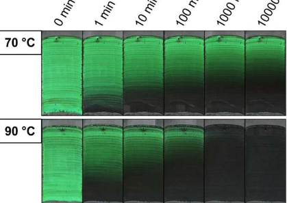 拜罗伊特团队现在利用这一发现来微调各种胶体晶体。稳定颗粒比例逐渐变化的胶体晶体现在承担了传感器的功能:在规定时间内温度越高,颜色损失沿梯度方向扩散得越远。恒温期间的时间越短,这个过程就越早中止。由于颜色损失在任何情况下都是不可逆的,因此传感器记录环境温度水平作为时间的函数。