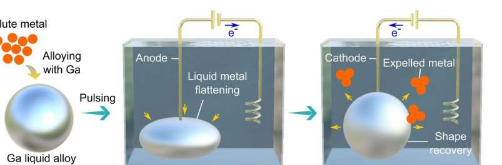 研究人员发现了一种从液态合金中提取这些金属晶体的新方法。通过向液态金属液滴的表面施加电压,他们能够充分降低表面张力,从而将金属晶体拉出。