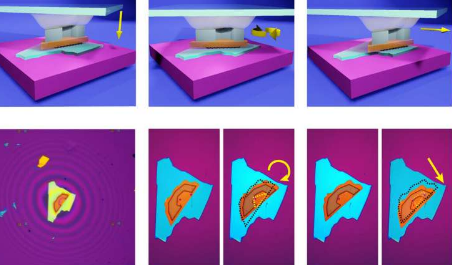 在异质结构中操作目标薄片的步骤很容易遵循。通过降低聚合物凝胶手柄,PDMS 半球与 PMMA 贴片接触。当它们相互接触时,人们可以轻松地移动或旋转底部薄片表面上的目标二维晶体。二维薄片的这种平滑运动是基于两种晶体结构之间的超润滑性。