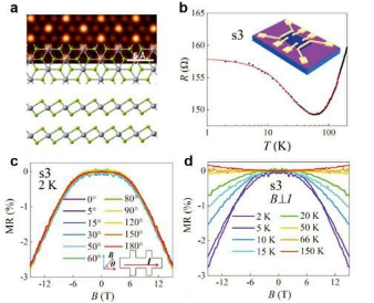 在低温下,当施加面内磁场时会检测到各向同性负磁阻 (NMR)。进一步分析表明,纵向阻力随温度和各向同性核磁共振的降低呈对数增加源于近藤效应。众所周知的近藤效应通常出现在掺杂有磁性杂质的非磁性金属中,这是由非磁性主体的传导电子自旋与磁性杂质之间的交换相互作用引起的。然而,表征结果表明PtSe 2薄片中没有磁性元素。