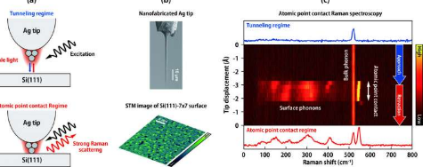 研究团队应用与弗里茨-哈伯研究所合作开发的最先进的低温尖端增强拉曼光谱,从硅表面获取振动光谱。尖端增强拉曼光谱技术在材料和纳米级光之间进行了强烈的光-质相互作用(局部表面等离振子共振)) 在原子级锋利的金属尖端产生。该研究小组发现,银尖端和重建的Si(111)-7×7表面的原子点接触形成导致拉曼散射的极大增强。图 1a 说明了该实验。由聚焦离子束(图 1b,顶部)制造的锋利的银尖端移向硅表面(图 1b,底部),同时监测结的拉曼光谱。图 1c 显示了获得的拉曼光谱的瀑布图,其中横轴代表拉曼位移,色标代表拉曼强度。当尖端处于隧穿状态时,在520 cm -1处仅观察到体硅的光学声子模式. 然而,当尖端和表面之间的原子点接触时,突然出现来自表面声子模式的强拉曼散射。当尖端移离表面并且原子点接触中断时,这些模式再次消失。