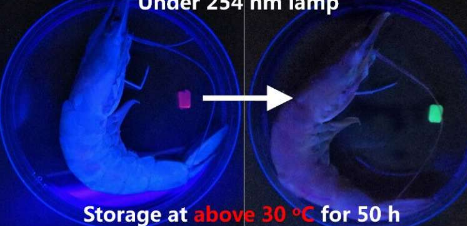 为了测试由两种发光素水凝胶制成的化学传感器检测海鲜新鲜度的能力,Lu及其同事将由这种材料制成的测试条密封在装有新鲜虾或鱼的盒子中,持续50小时。储存在低于-10 C的海鲜中的测试条与原来的红色荧光色几乎没有变化,表明食物仍然很新鲜,而储存在30 C的海鲜中的测试条转变为鲜艳的绿色,表明食物宠坏了。